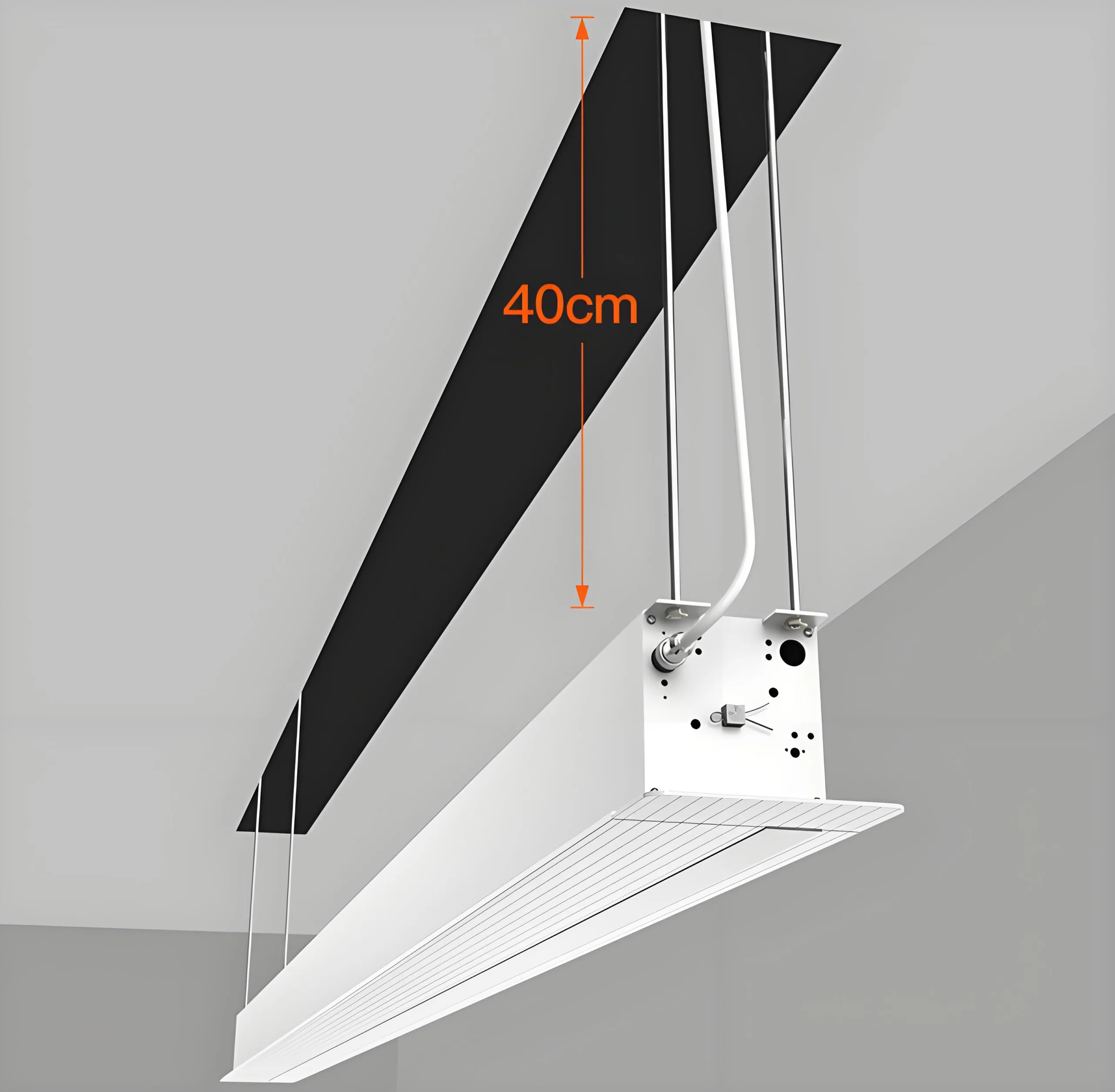 Unlike conventional screens, this cutting-edge solution is designed to be discreetly housed within a suspended ceiling when not in use, descending only at the touch of a button to deliver a dramatic, cinema-quality experience.