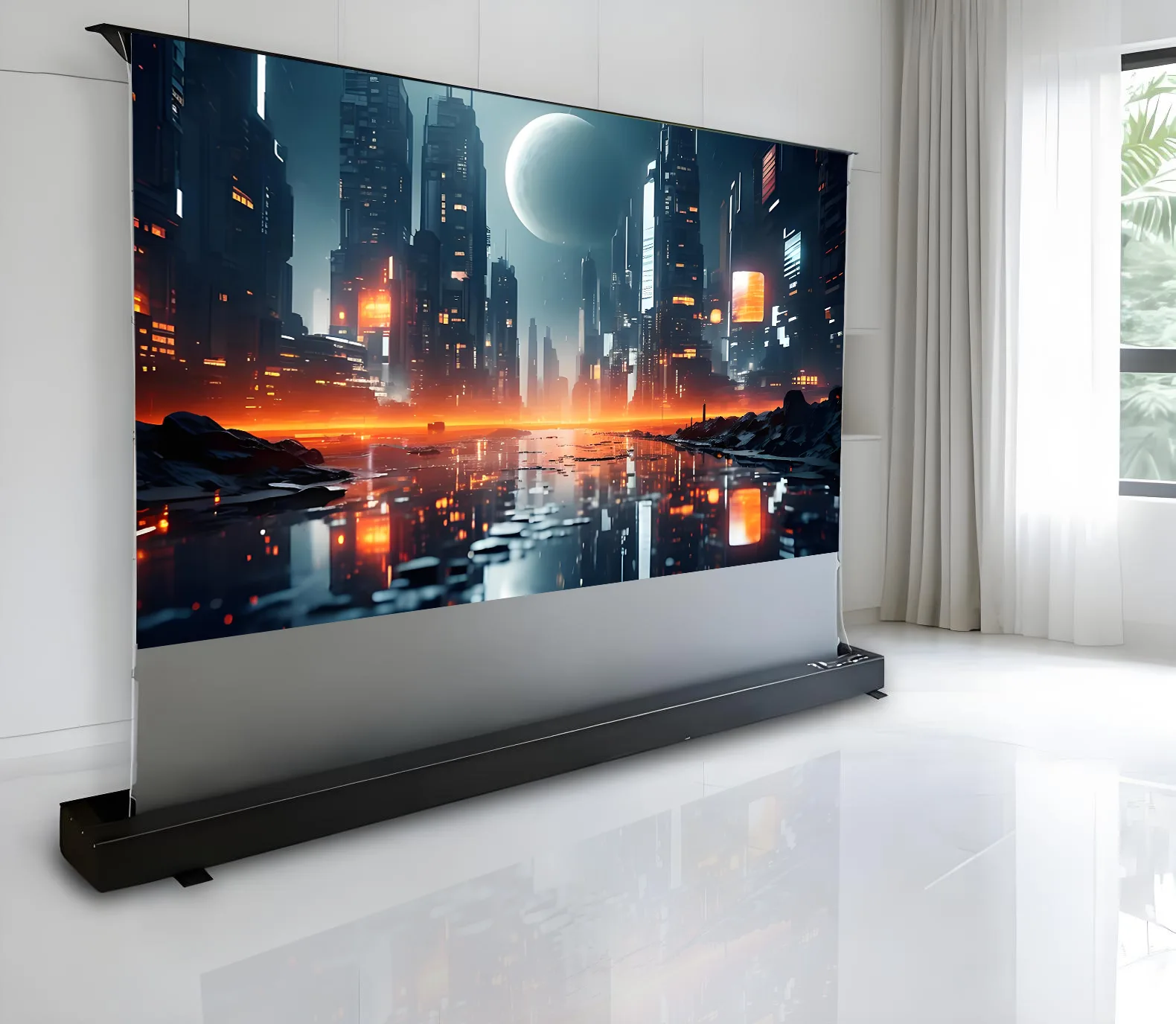 The Transparent Acoustic Electric Floor Rising Screen is a premium projection screen made for ultra-short throw laser projectors or laser TVs. It sits on a TV console or directly on the floor. With the push of a button, it rises smoothly for use and retracts neatly into its base when not needed.