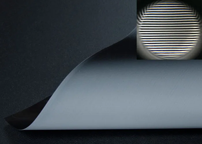 - Structure: The screen surface uses a horizontal sawtooth prism structure composed of alternating black and white layers. The white angled surfaces reflect light from the projector (positioned below), while the black layers absorb ambient light from above and the sides.