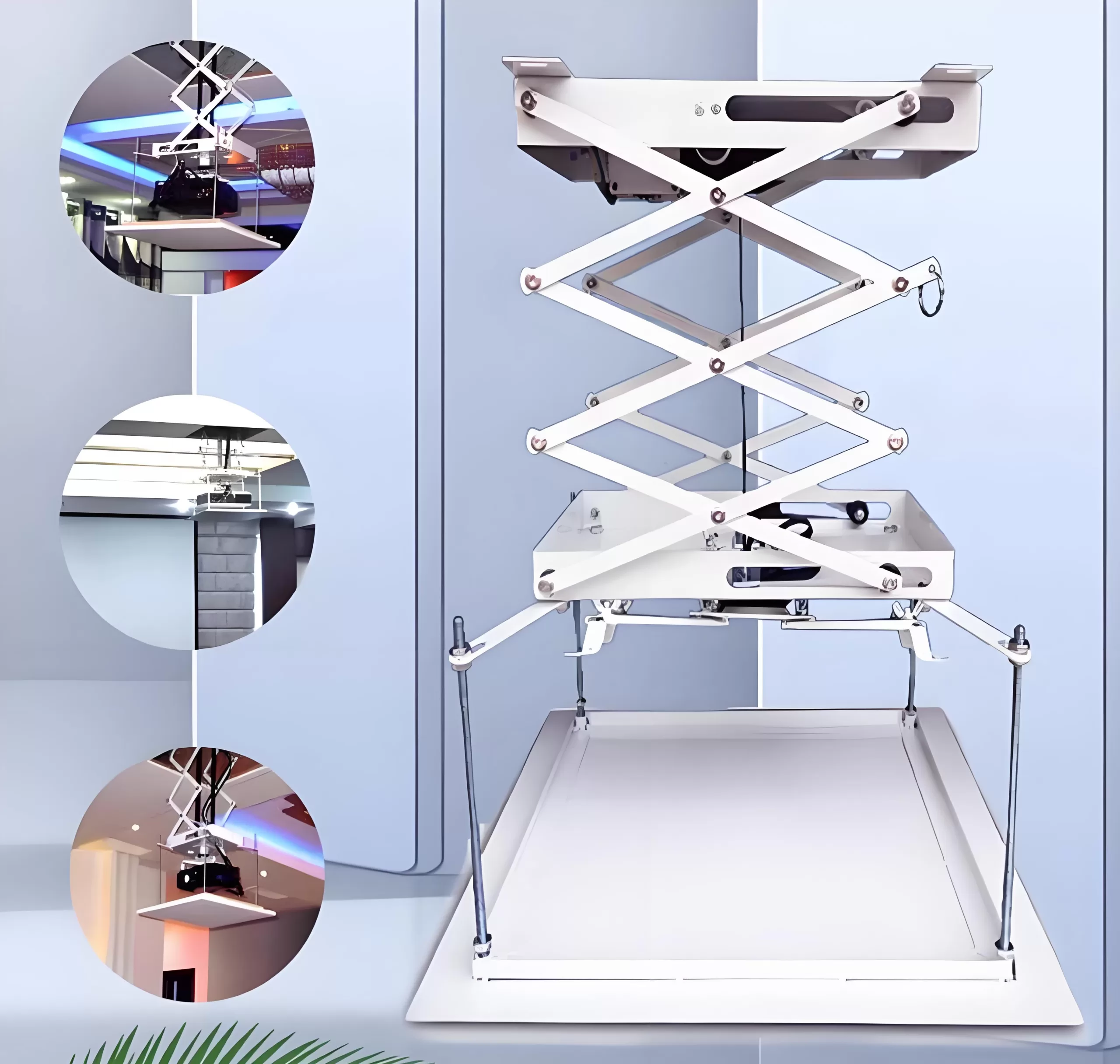 Ultra thin projector lift is a designed for limited ceiling space to install projectors. Its main feature is to fix the projector on the ceiling and realize lifting and adjusting the angle by electric means for easy use and storage. This lift has an ultra-thin design,which is designed to save space and keep the indoor environment clean and beautiful